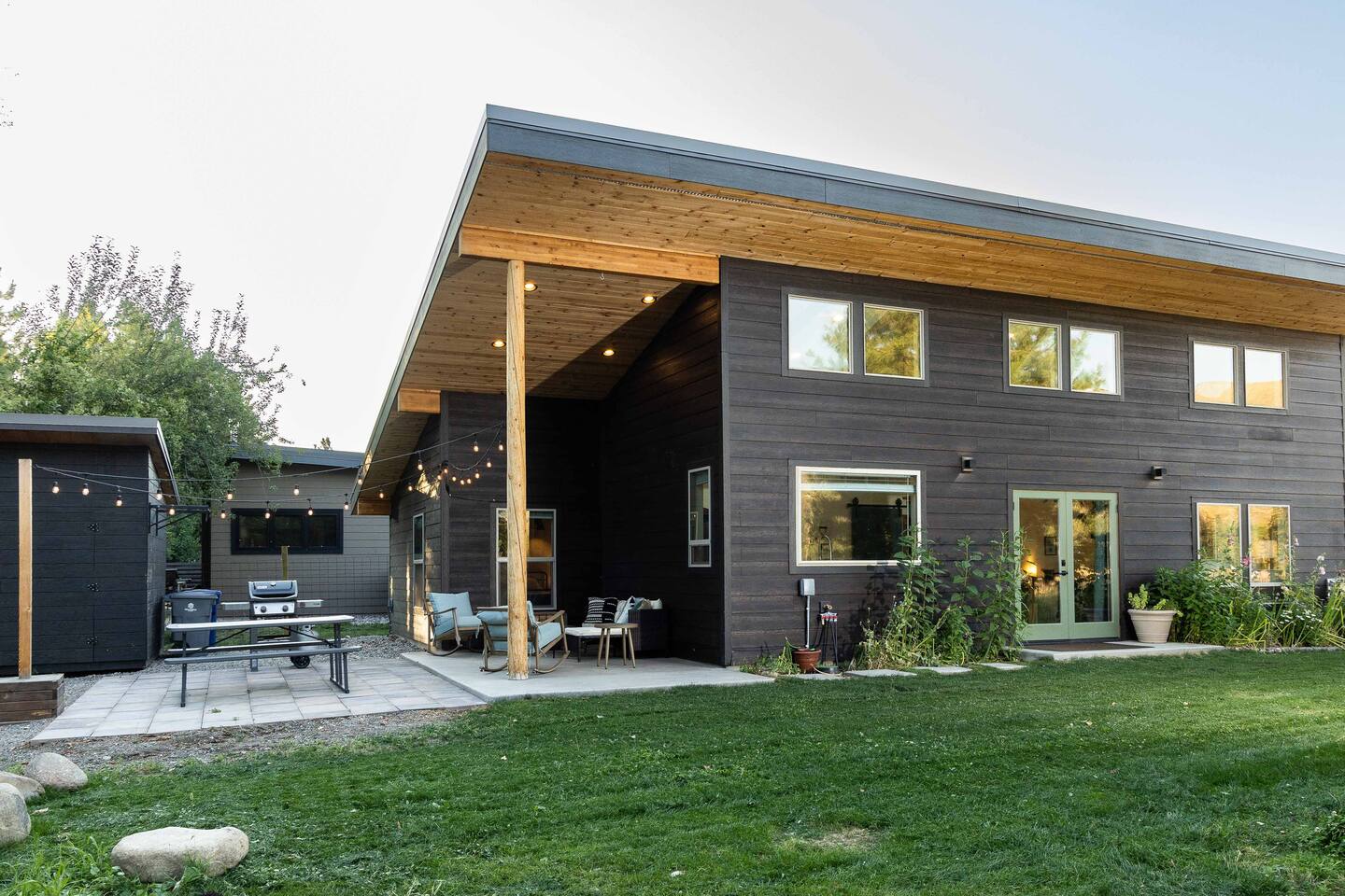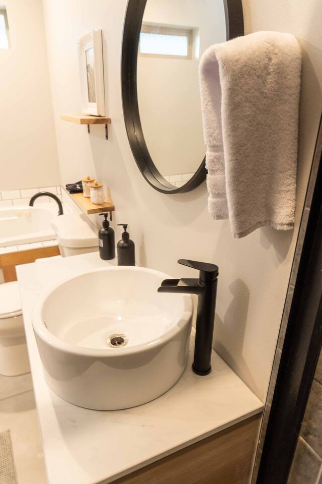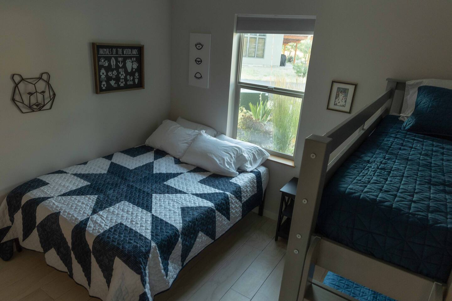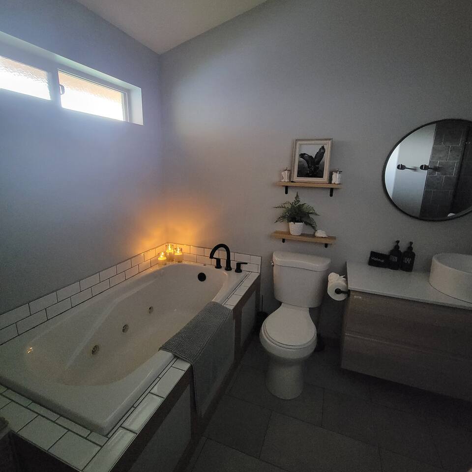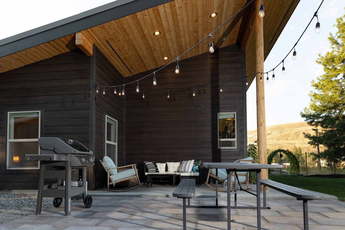 Welcome to the Winthrop Basecamp! This is a new home built in 2020 and features open dining/kitchen/living space with vaulted ceilings. It is centrally located and family friendly with a fenced backyard and patio. There is a master bedroom with ensuite bathroom, jetted tub, tiled shower and laundry station. The other bedroom features a queen bed, bunk bed with a full bathroom right outside the door. A barn style door can close this bedroom and bathroom off from the main living area making it feel like a second master bedroom with ensuite bathroom. We have a small booster/high chair that can be secured to one of the dining chairs as well as a few books and toys for our younger guests. The patio space features string lights, a sturdy picnic table and outdoor lounge furniture as well as a propane BBQ.