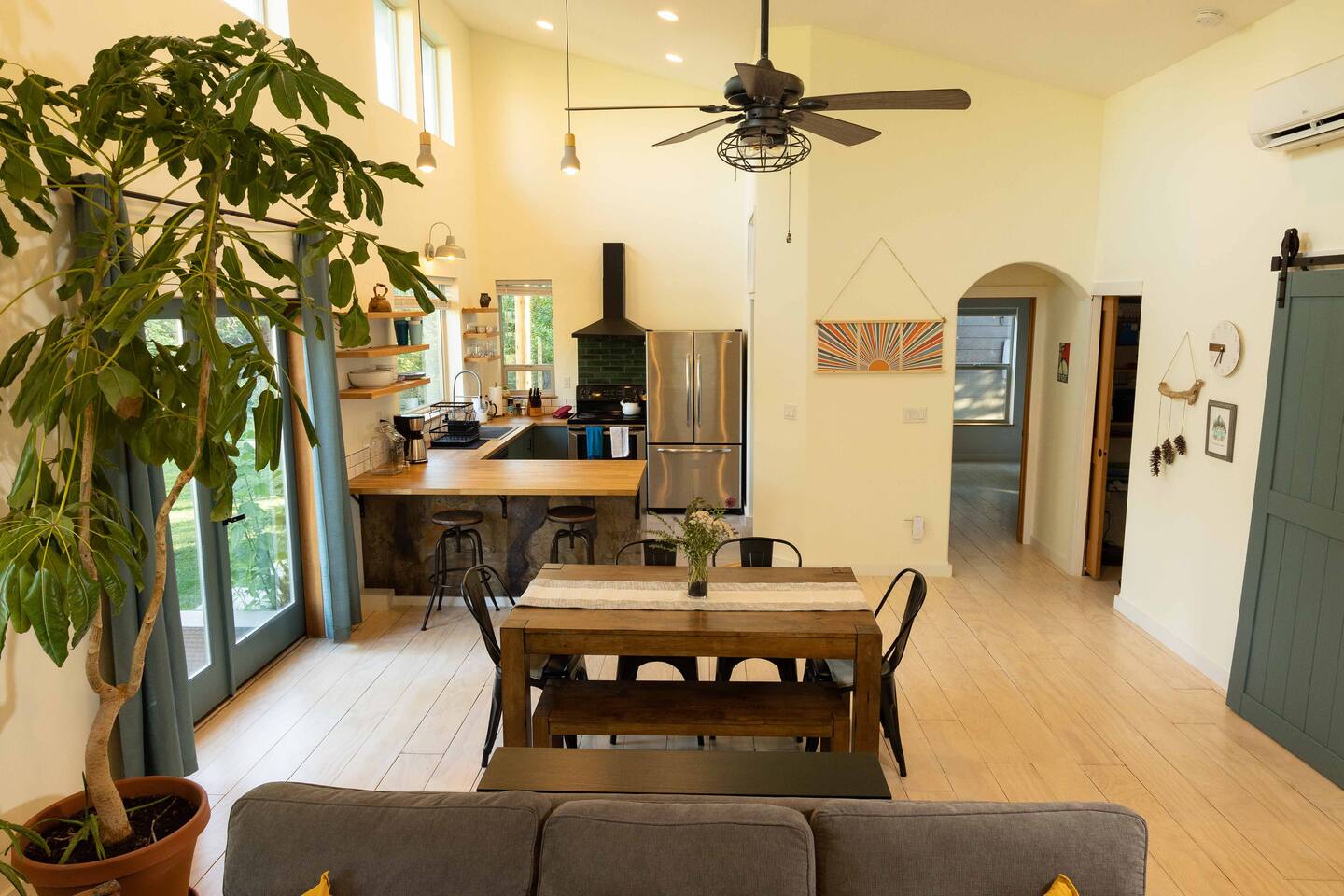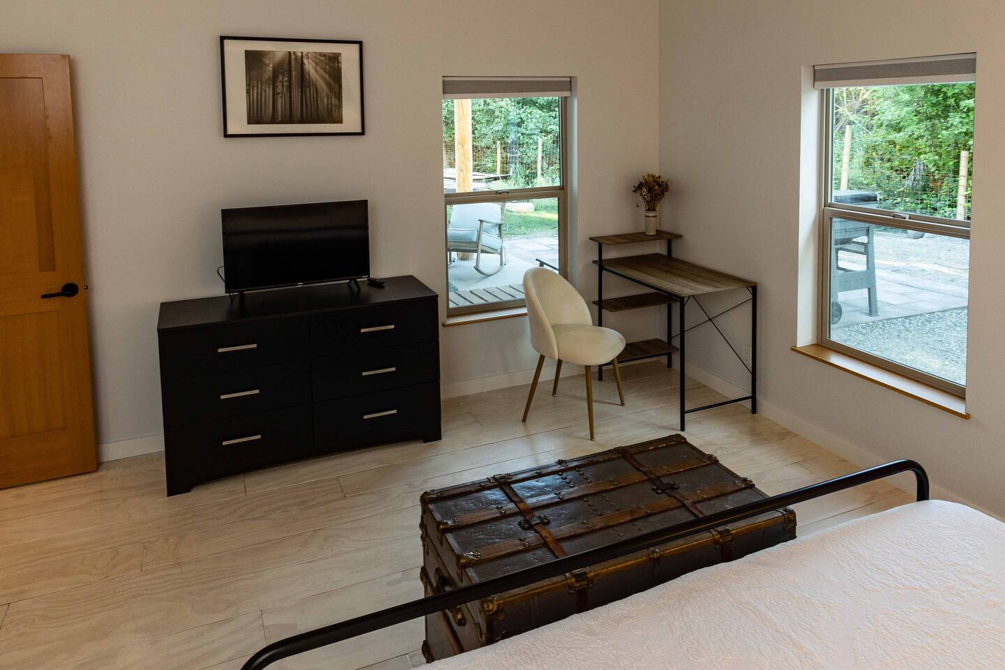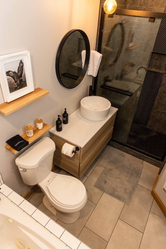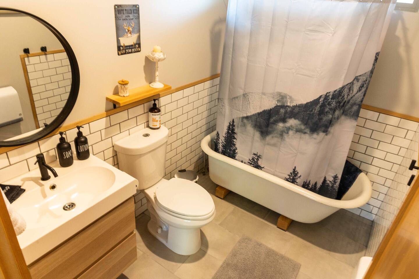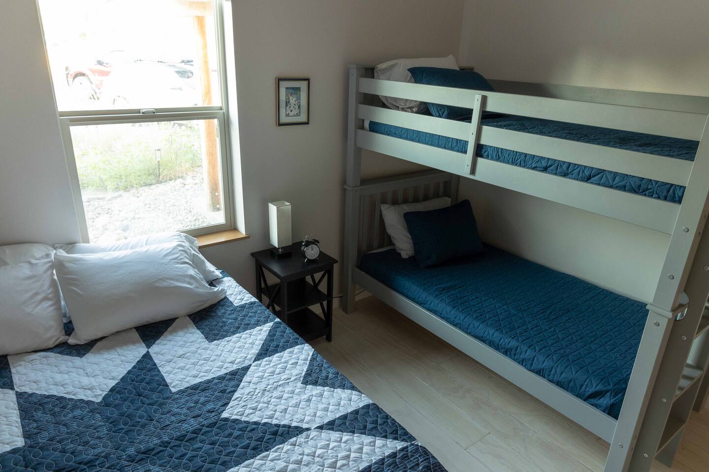 Welcome to the Winthrop Basecamp! This is a new home built in 2020 and features open dining/kitchen/living space with vaulted ceilings. It is centrally located and family friendly with a fenced backyard and patio. There is a master bedroom with ensuite bathroom, jetted tub, tiled shower and laundry station. The other bedroom features a queen bed, bunk bed with a full bathroom right outside the door. A barn style door can close this bedroom and bathroom off from the main living area making it feel like a second master bedroom with ensuite bathroom. We have a small booster/high chair that can be secured to one of the dining chairs as well as a few books and toys for our younger guests. The patio space features string lights, a sturdy picnic table and outdoor lounge furniture as well as a propane BBQ.